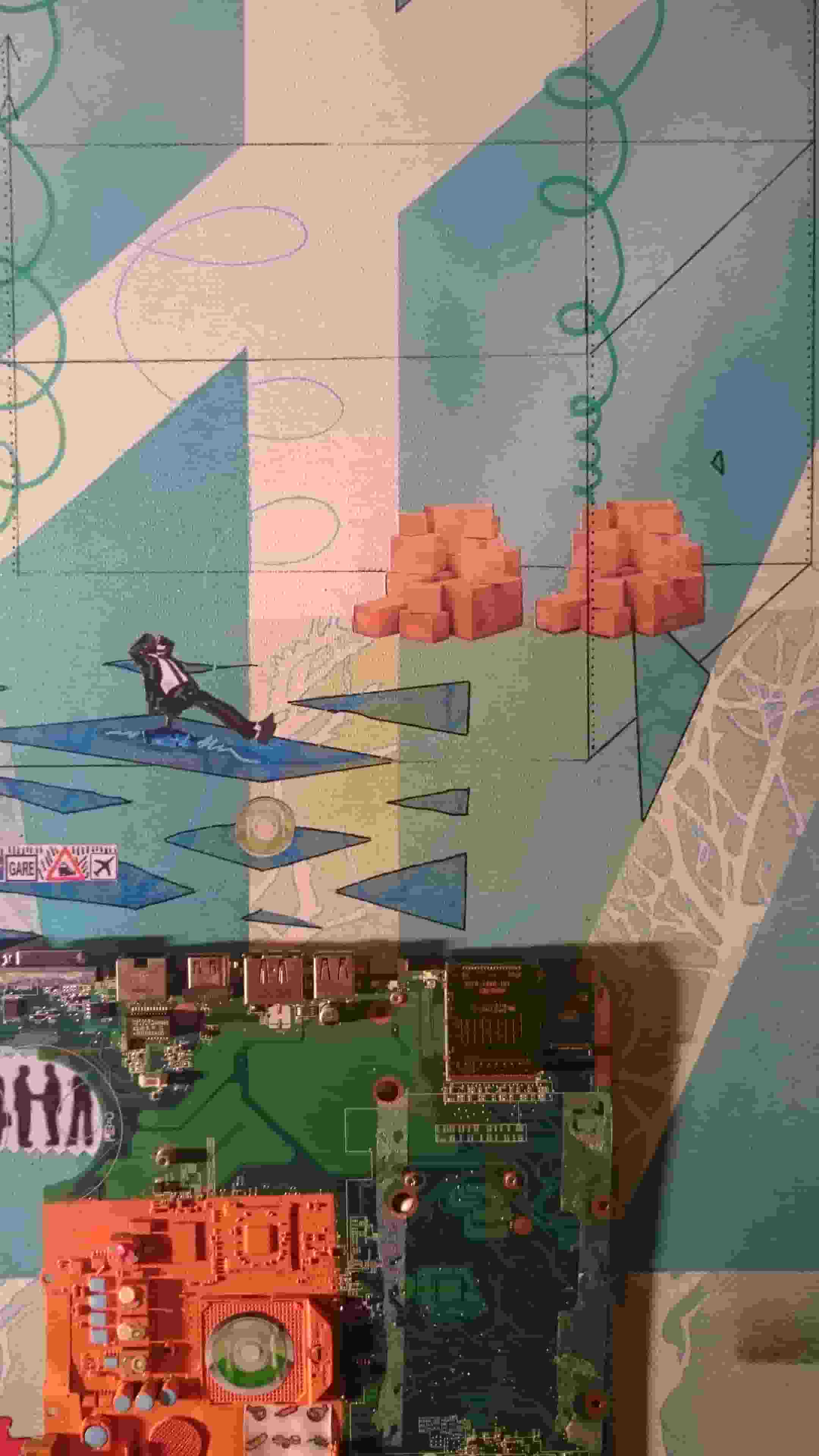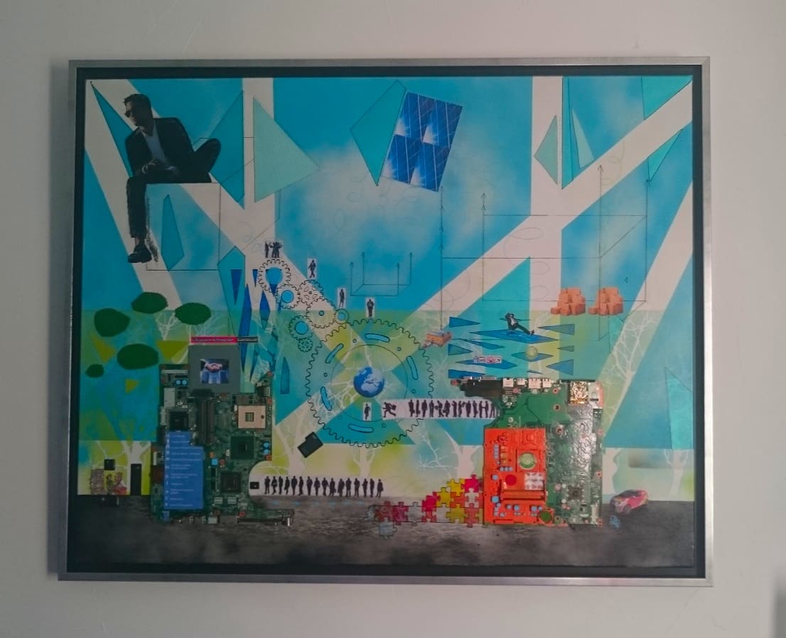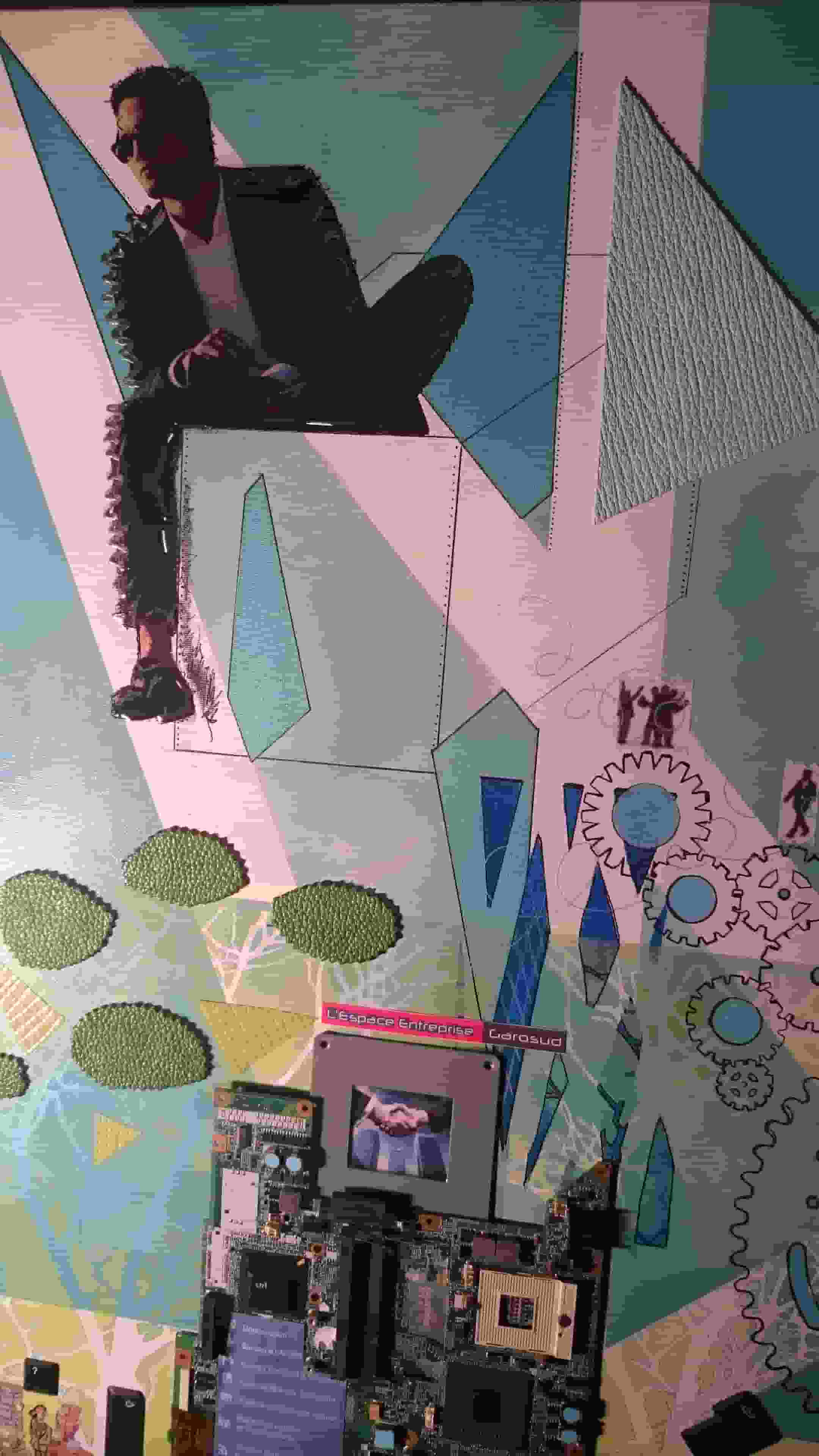 Le mélange peinture, collage et matériaux apporte plus de profondeur et d’originalité au tableau.