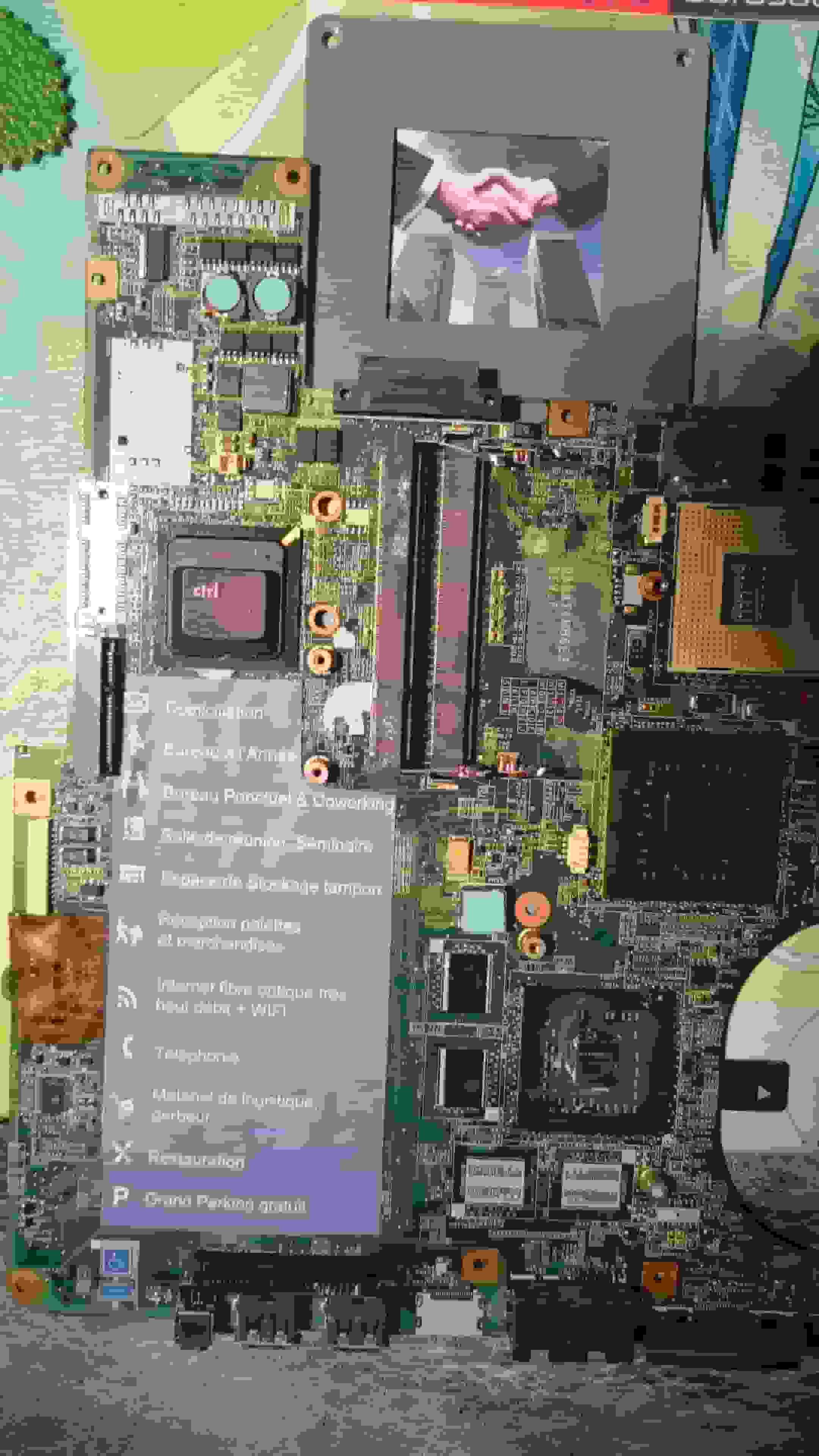 Les panneaux montrant l’accès facile aux autoroutes, tram, restaurant, aéroport.