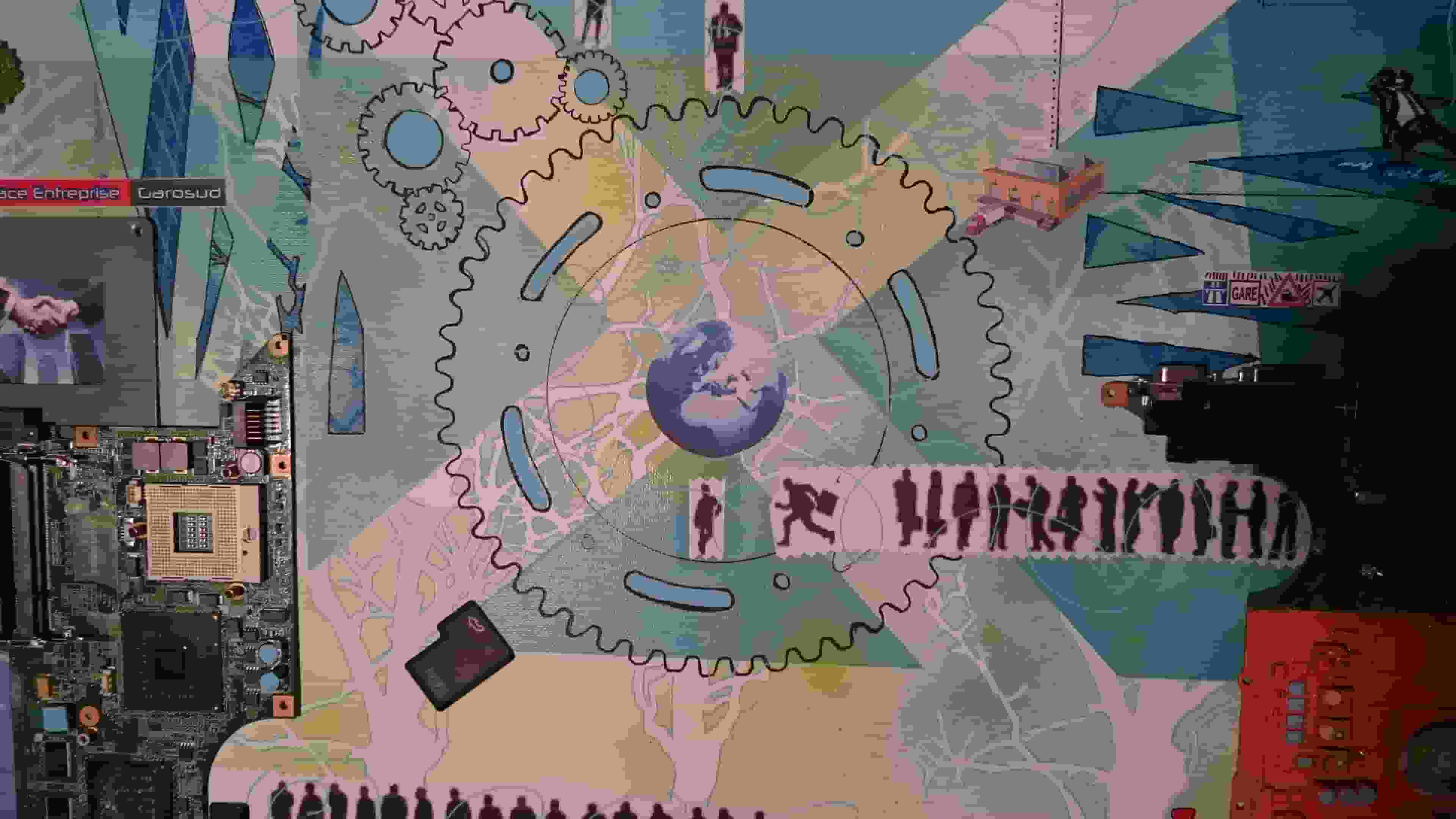 Ce point central avec le symbole de la terre appuie sur la notion de la puissance informatique d’ Espace Entreprises notamment les vidéos conférences et pouvoir ainsi être connecté au monde.