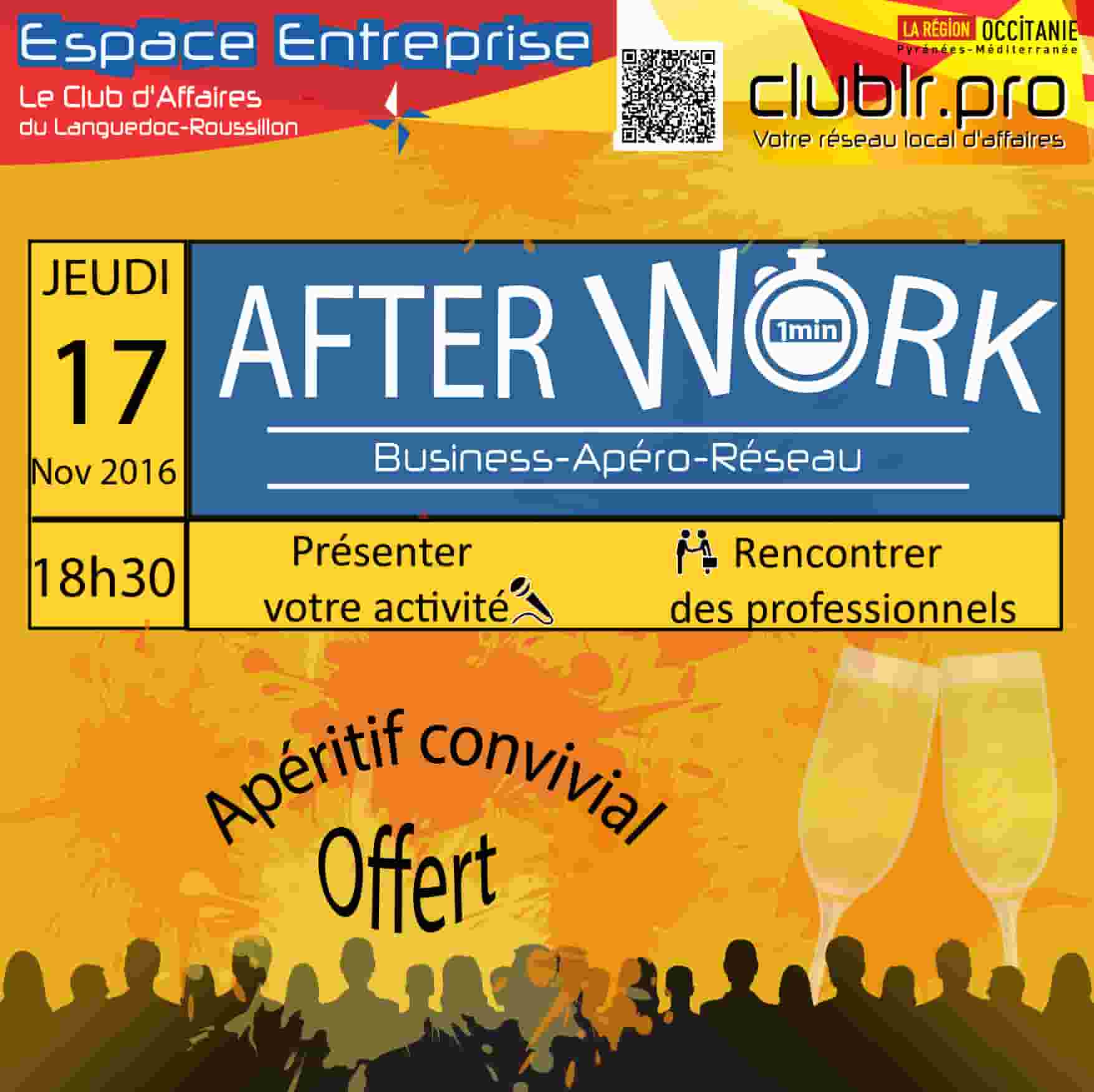 La soirée « Afterwork » est organisée par Le Club LR et Espace Entreprise, elle vous permet, de connaitre et vous faire connaitre à l’ensemble des membres présents et de développer ainsi votre réseau professionnel dans une ambiance conviviale.