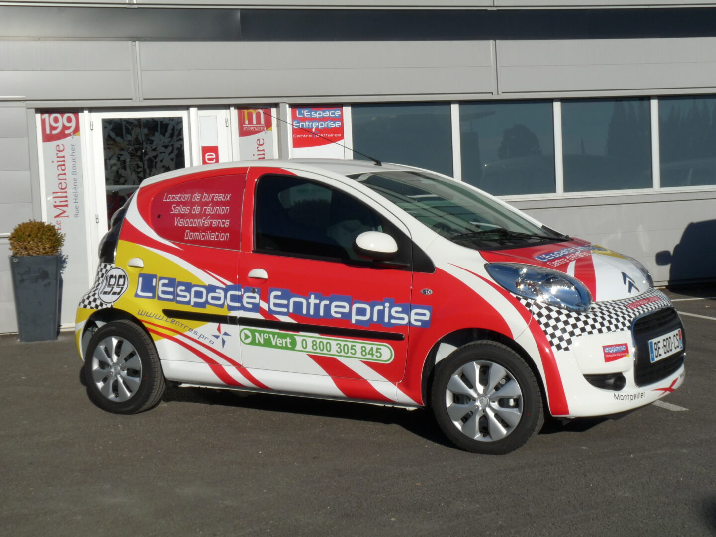Si l’objectif de L’Espace Entreprise est plus modeste , il n’en a pas moins l’ambition de créer une forte image auprès des publics visés surtout au sein des quartiers d’affaire tels que le Millénaire et d’accroitre la notoriété de la société. Ainsi sont parfaitement intégrés dans le design le nom et les coordonnées de la société ainsi que ses activités principales (Location de bureaux, salles de réunion, Visioconférence, Domiciliation). Même le numéro 199 correspondant à l’adresse postale de la société sera intégré de façon à créer le buzz puisqu’il apparait comme le numéro de concurrent de la voiture sur une hypothétique course . Certaines personnes ont même remarquées qu’il correspondait au numéro fétiche d’une légende actuelle du Super Cross. Comme quoi créer le buzz ne demande pas forcément des techniques ou des messages très complexes.